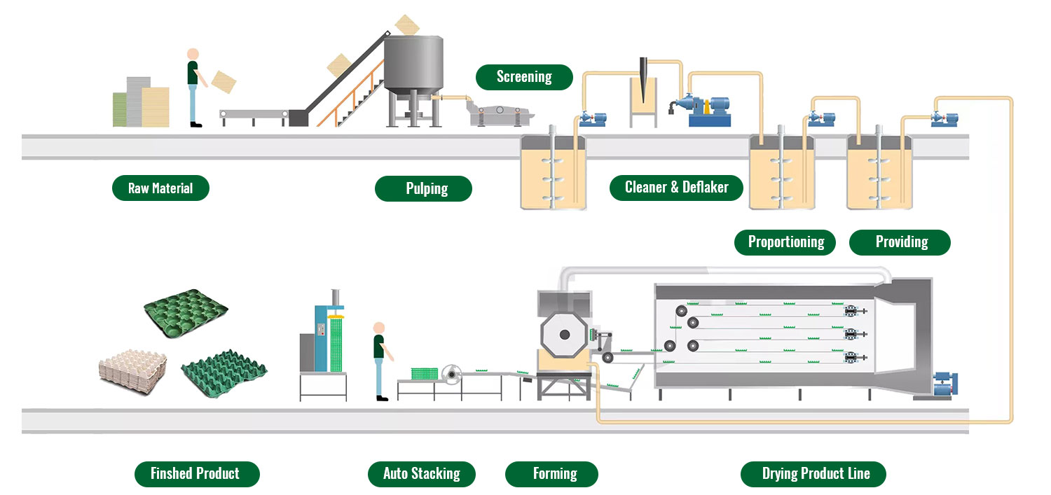 Egg Tray Machine, originally known as Pulp Molding Equipment, utilizes recycled materials such as waste book paper, newspapers, cartons, printing scraps, packaging plant residues, and paper mill tailings to produce biodegradable products including egg trays, cup holders, egg boxes, shoe supports, and protective paper padding for electronics packaging. The production steps are beating – forming – dehydration – drying – packaging. Its drying methods are generally divided into natural drying (drying in the sun), drying box, civil drying, multi-layer metal drying, etc.