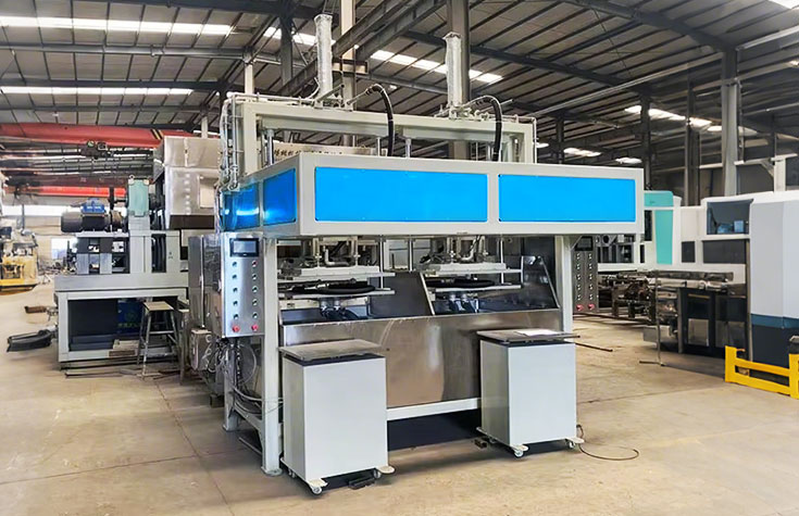 This small machine can produce 1,000-1,500 pieces per hour. It offers high cost-effectiveness, a simple structure, and easy operation. It is suitable for small to medium-sized production,. It can handle custom-shaped trays up to 8 cm in height, such as egg trays, coffee cup trays, and egg cartons.